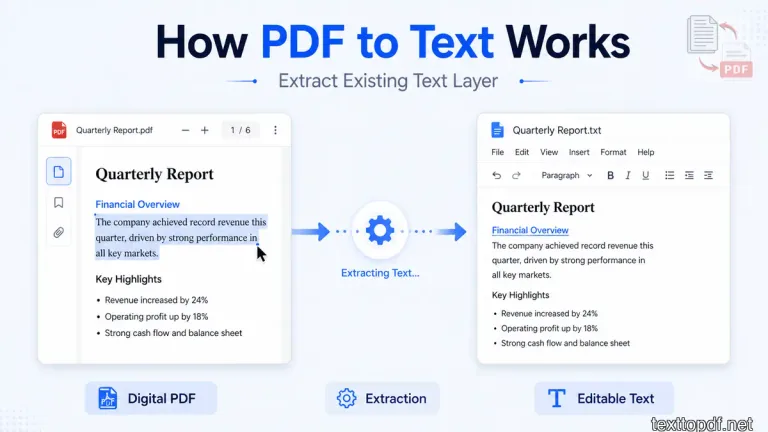 Many users search for online and free options because they want quick results without installing software. When you use an online PDF to Text tool, the system uploads your file and extracts text from the existing text layer. When you use an online OCR tool, the system processes the file as an image and then returns recognized text.