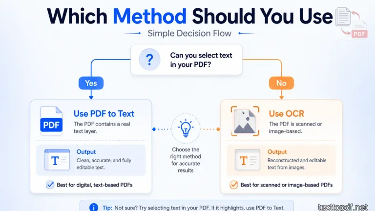 In most cases, you should first try the PDF to Text tools if the file allows selection. This gives you faster output and fewer errors because the text already exists inside the file. If the file does not allow selection, you should switch to OCR instead of trying multiple extractors.