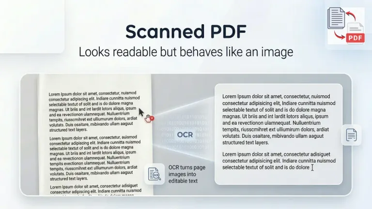 A scanned PDF is usually a document made from a paper scan, a photographed page, or another image saved as PDF. The words may look readable on screen, but the file often behaves like an image until OCR is used.