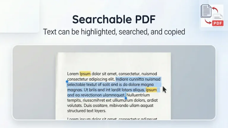 A searchable PDF is a document that contains a real text layer inside the file. Because of that, words can usually be highlighted, searched, copied, and extracted with a normal PDF to Text workflow.